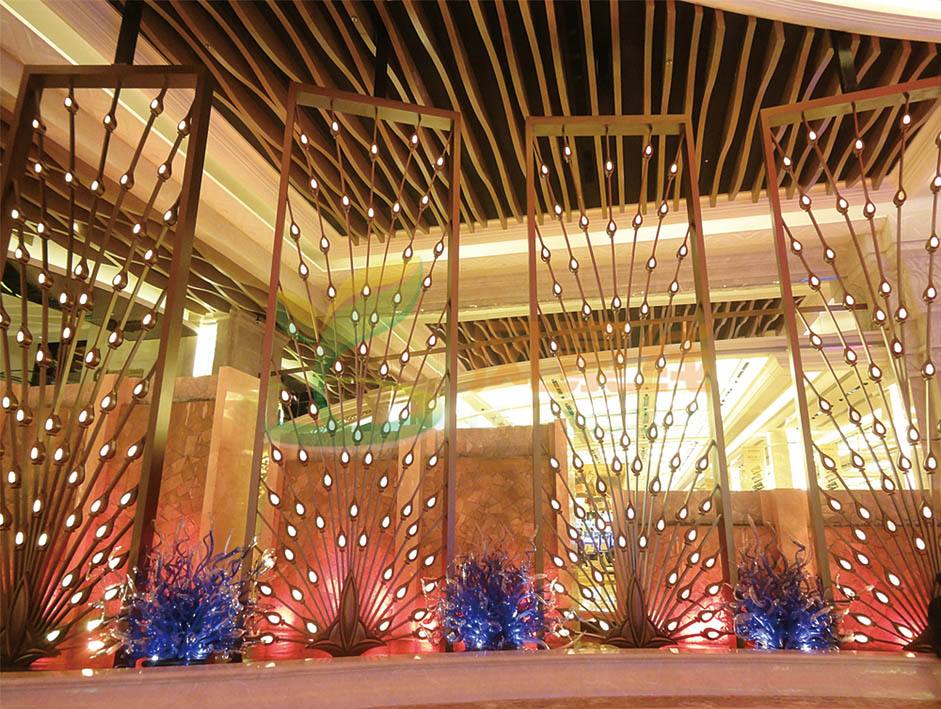 所謂鏤空工藝,就是在金屬材料上,比如不銹鋼板上采用激光切割技術(shù)雕出造型,也可以采用鋁合金材料把花型鏤空出來,制作而成的屏風花格。就拿不銹鋼板來說吧,不銹鋼板常見的材質(zhì)標號有201# 304# 316#,其中采用304#不銹鋼板來制作鏤空不銹鋼屏風是比較多的,304不銹鋼材料因為其優(yōu)良的延展性,拉絲文理性,以及拋光鏡面性能卓越,價格又要比316不銹鋼要便宜許多,所以304不銹鋼廣泛應(yīng)用于各類高檔場所,如酒店、別墅、會所、餐廳。